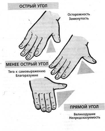 Если угол острый, то есть большой палец отклоняется недостаточно сильно, значит, перед вами человек осторожный, эгоистичный и далеко не откровенный.