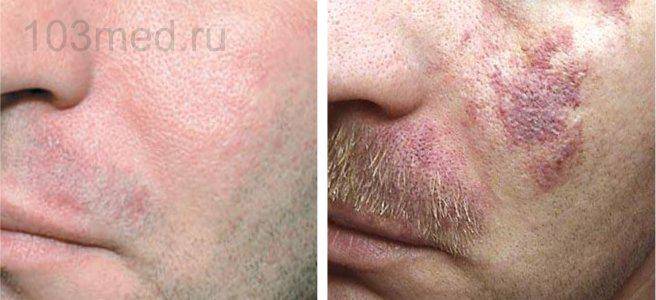 Примечание! На начальных стадиях ее трудно распознать, так как сначала кожа краснеет понемногу, и появляются лишь небольшие пятна непропорциональной формы. Далее со временем пятна объединяются в одно большое образование, в котором находятся мелкие кровеносные капилляры.