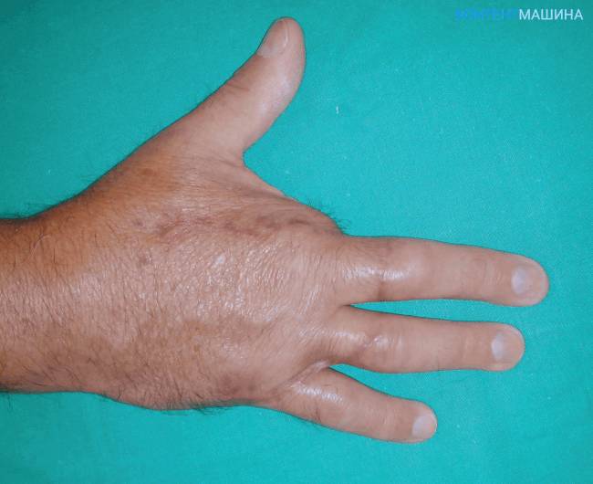 - После разреза кожи пальцы максимально сгибаются, хирург вскрывает суставные полости, рассекает сухожилия, нервы и перевязывает сосуды пальцев;